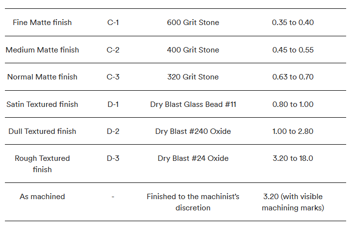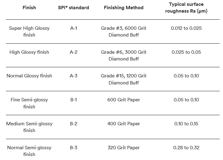 Questa tabella contiene tutte le finiture superficiali per stampaggio a iniezione SPI che offriamo.
